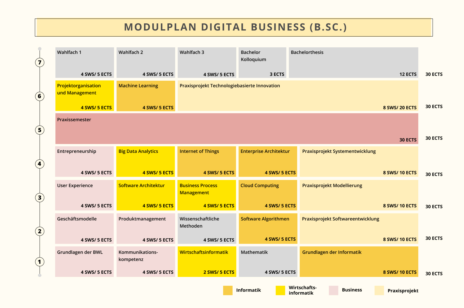 Der Studiengang Digital Business ist ein spezialisierter Teilbereich der Wirtschaftsinformatik und beschäftigt sich im Kern mit der digitalen Transformation. Der Studiengang kombiniert hochaktuelle Themen aus den Bereichen Wirtschaftsinformatik und Wirtschaftswissenschaften. In den ersten Semestern werden dabei wichtige Grundlagen vermittelt, bevor in den höheren Semestern vermehrt interdisziplinäre Veranstaltungen angeboten werden.